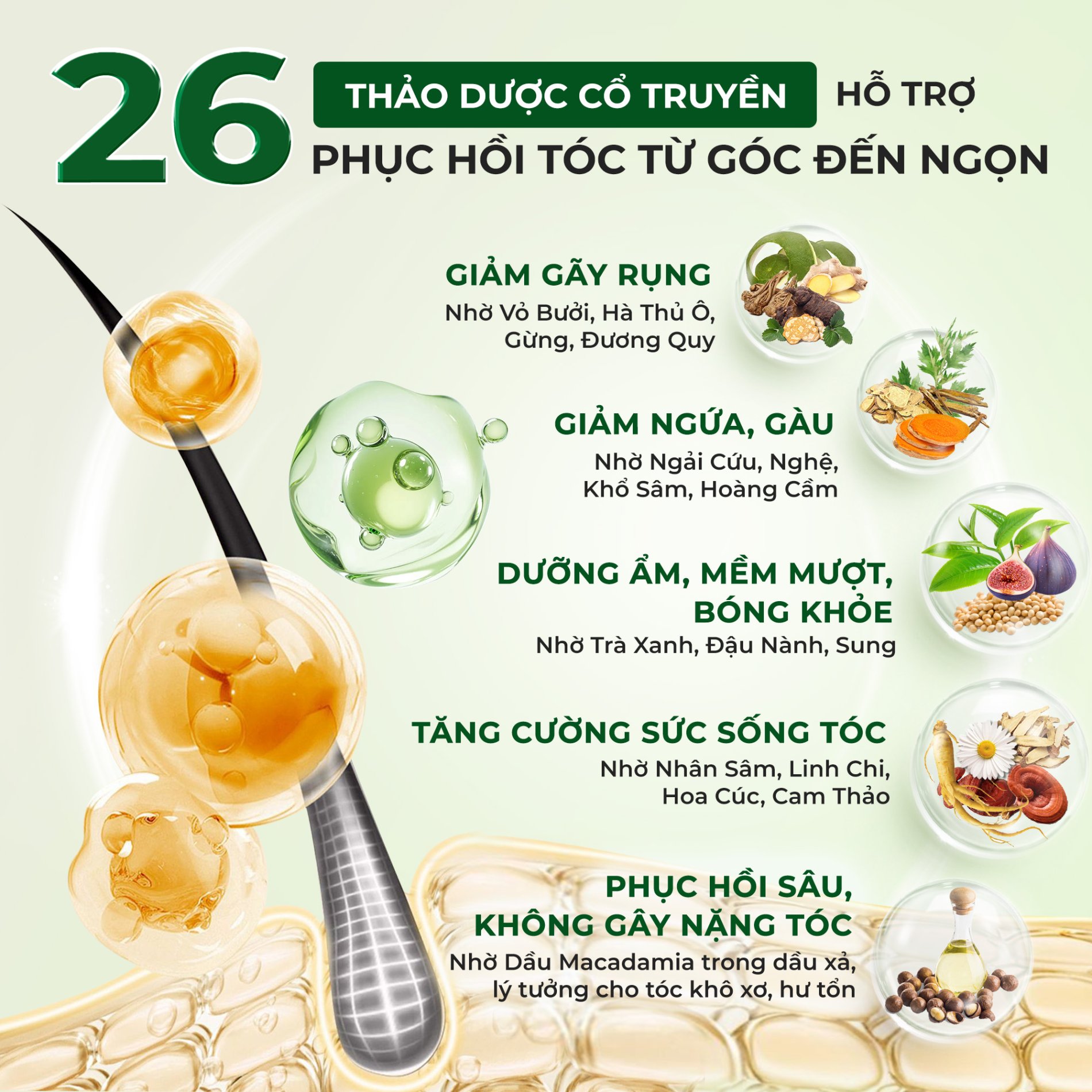 - Hỗ trợ mái tóc tràn đầy sức sống: Nhờ Nhân Sâm, Linh Chi, Hoa Cúc, Cam Thảo.